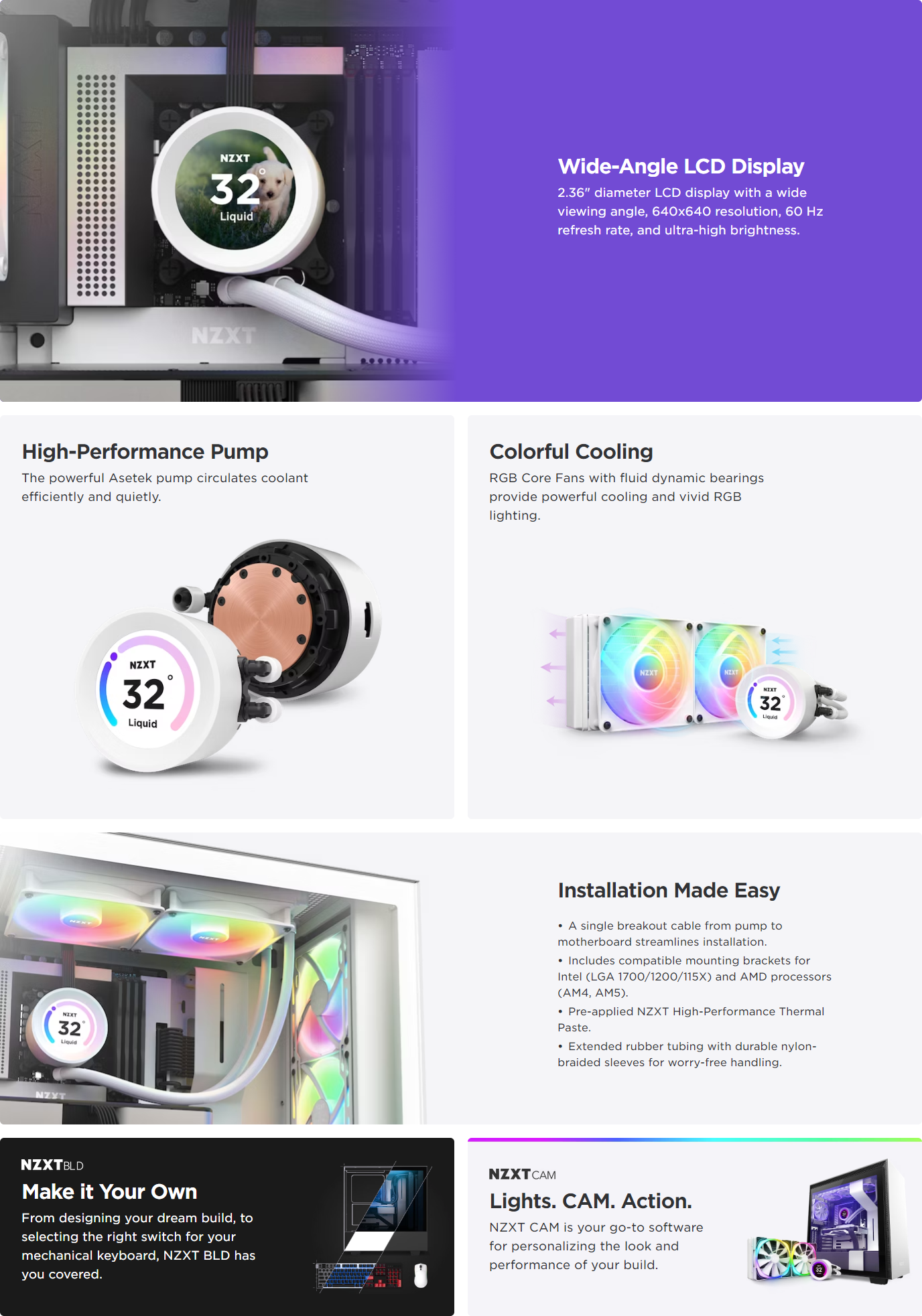• Control custom screen content, RGB, pump speed, and zero-noise fan curves with NZXT CAM software.