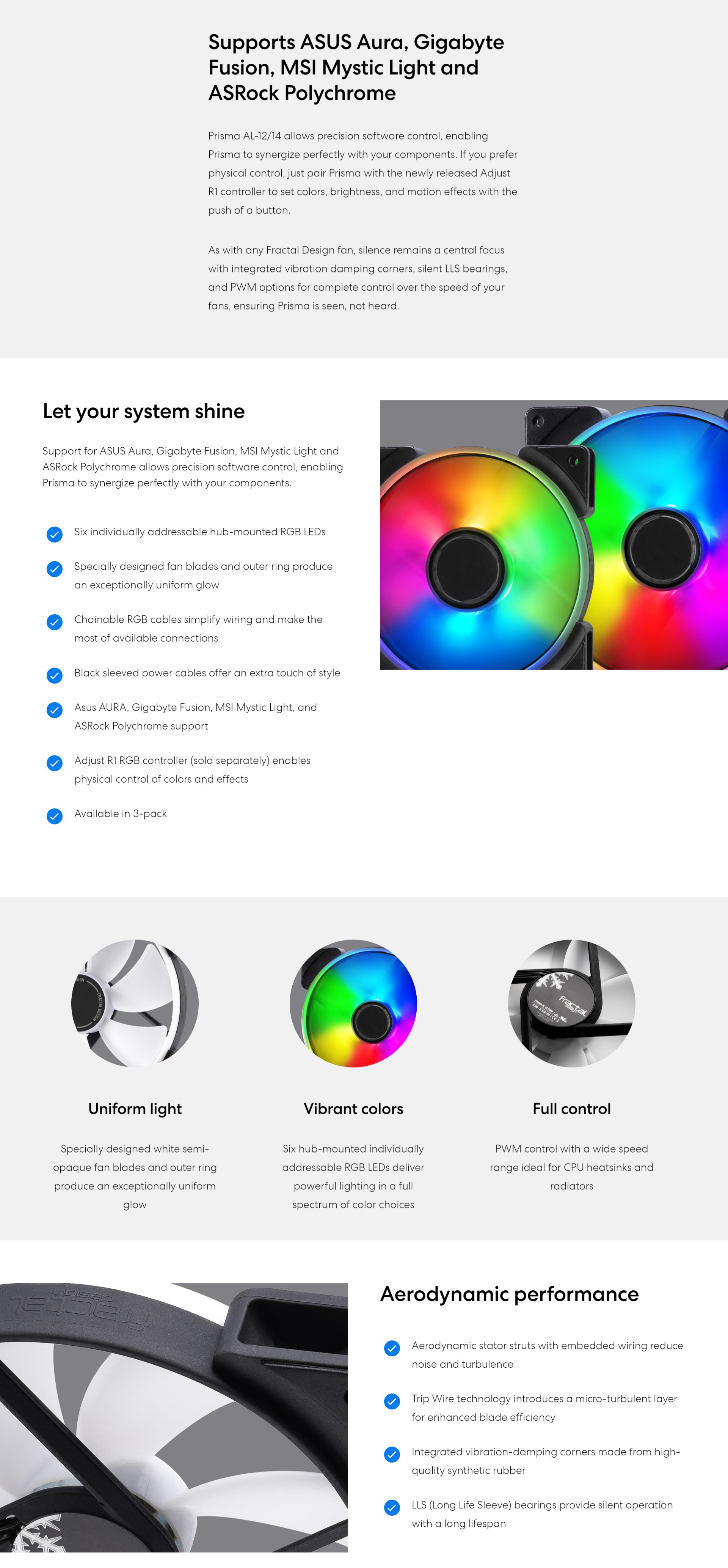 Fractal Design Prisma AL Series ARGB fans allow your system to truly shine. Six hub-mounted addressable RGB LEDs work in harmony with a white semi-opaque outer ring and fan blades to produce a beautifully uniform glow across the fan's entire surface.