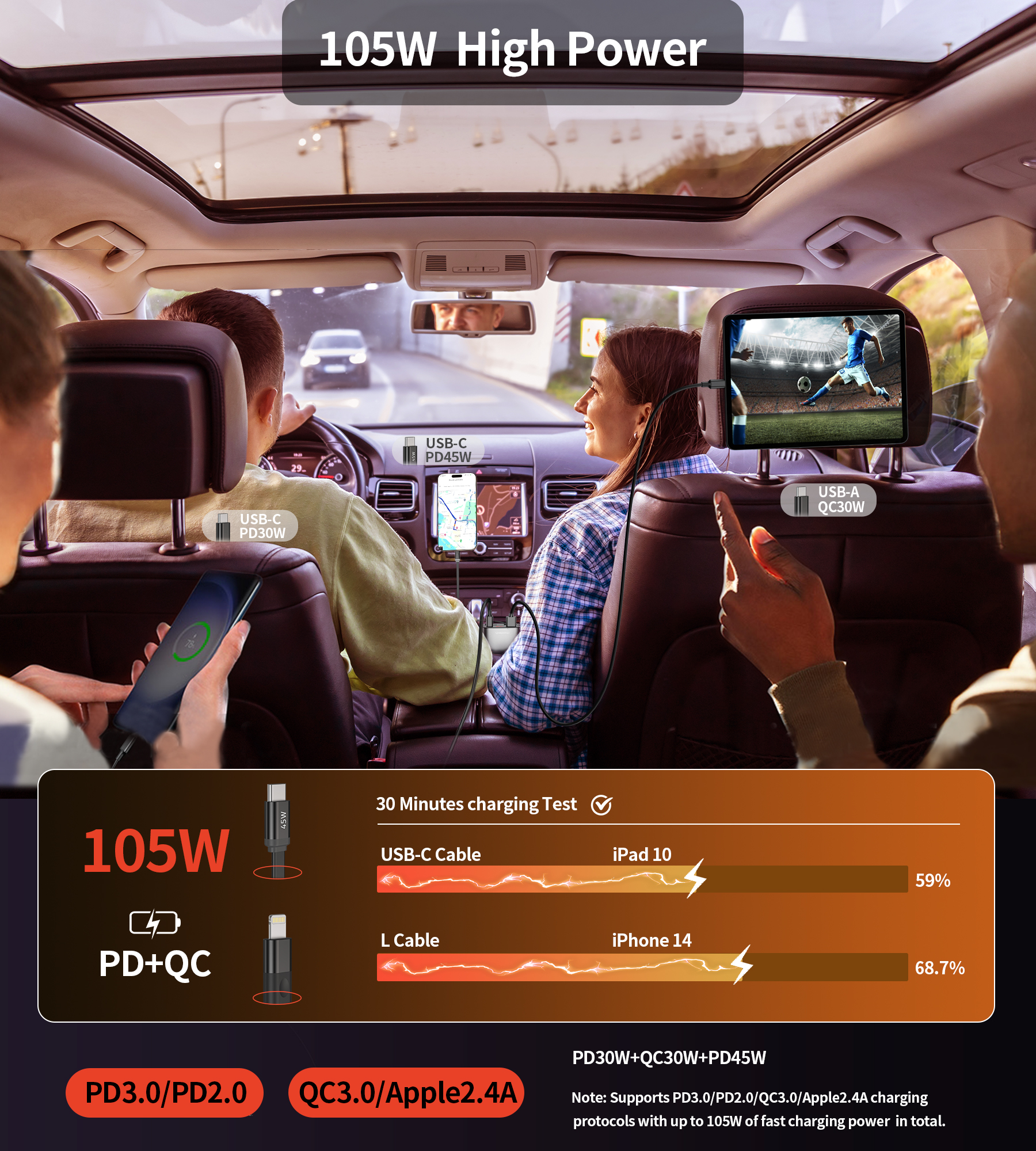 Specifications: 105W / USB-A + USB-C(with Cable)