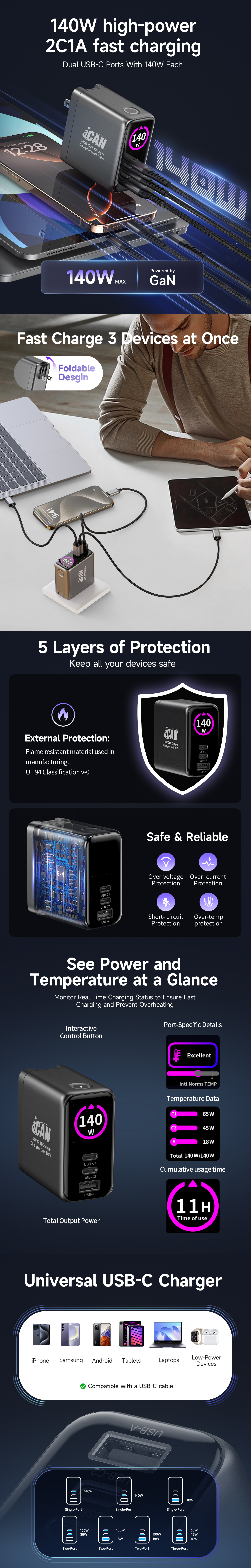 iCAN PD-136 140W 3-Port USB-Ax1 USB-Cx2 GaN Display Wall Charger