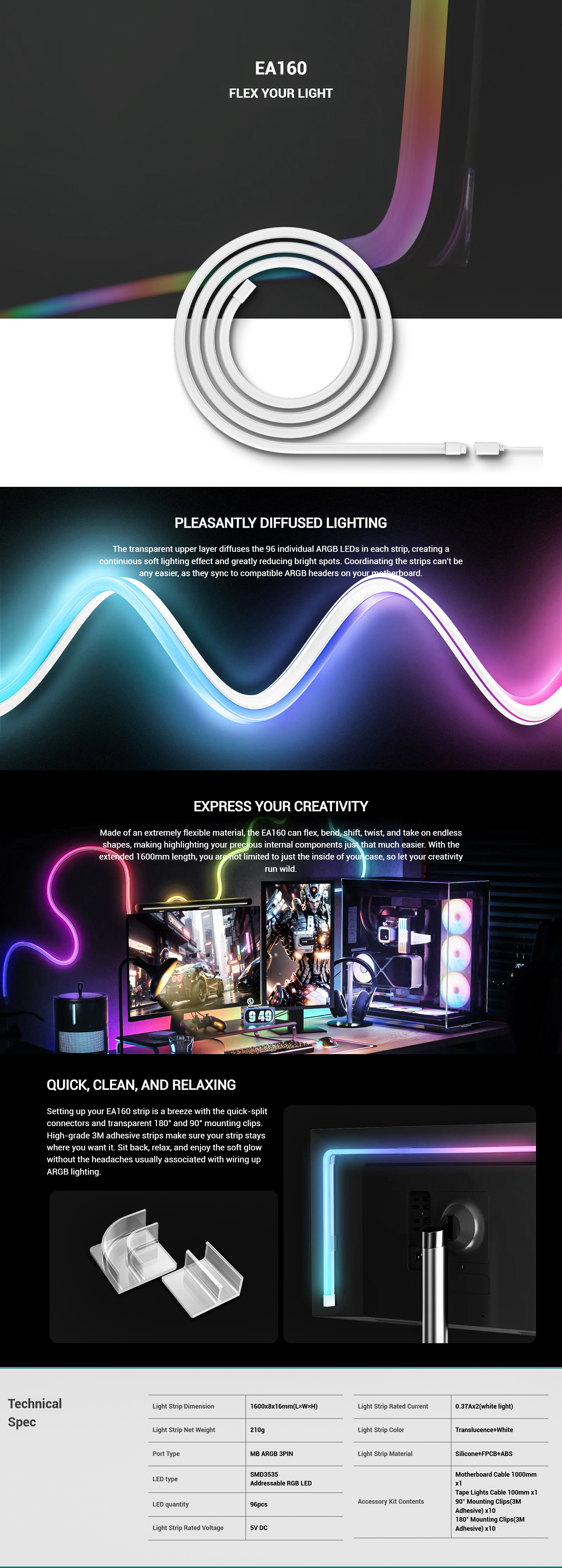 • DeepCool EA160 ARGB strip, Diffused lighting, Flexible, 1600mm strip, Transparent Mounting Clips, 3M adhesive strips(Open Box)