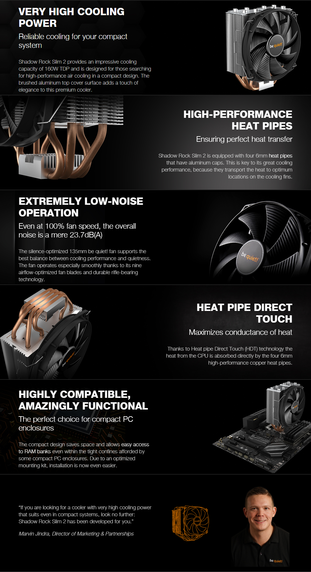 Shadow Rock Slim 2 is equipped with four 6mm heat pipes that have aluminum caps. This is key to its great cooling performance, because they transport the heat to optimum locations on the cooling fins.