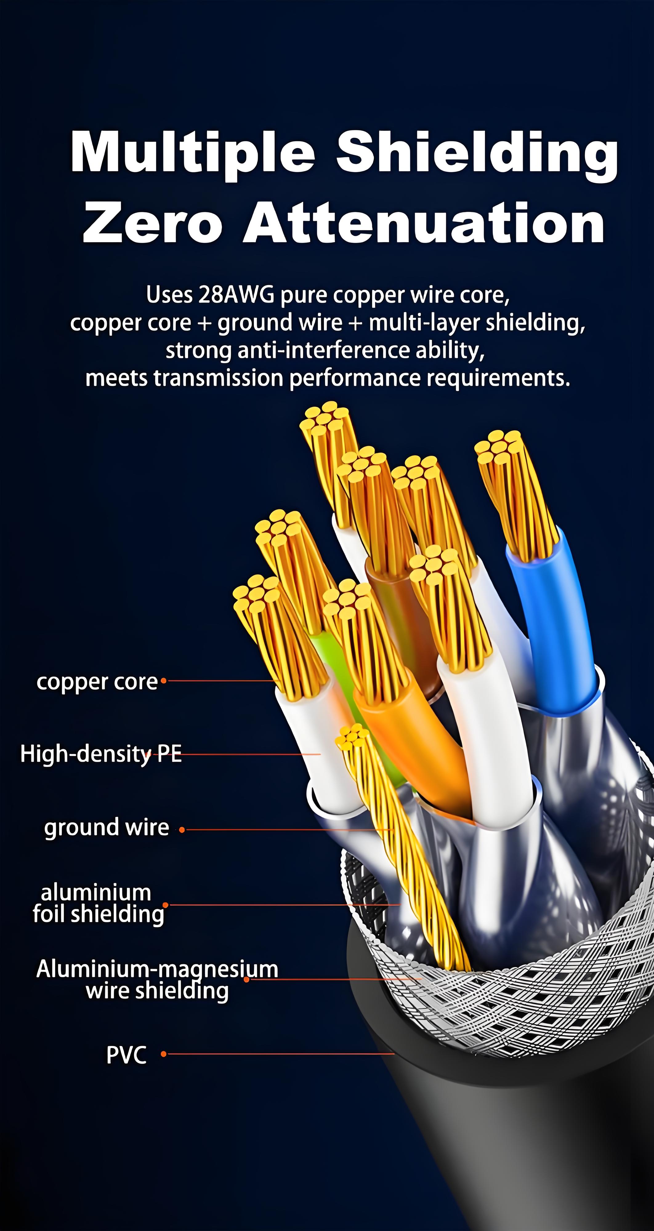 • Heavy duty-----The quadruple shielded Cat8 Network cable is super efficient in reducing EMI/RFI Interference and provide highest fidelity for long distance data transmission.