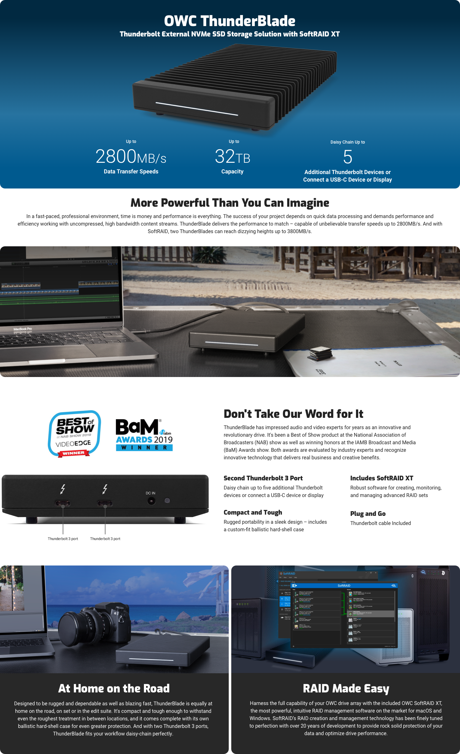 In a fast-paced, professional environment, time is money and performance is everything. The success of your project depends on quick data processing, and demands performance and efficiency working with uncompressed, high-bandwidth content streams. ThunderBlade delivers the performance to match - capable of unbelievable transfer speeds up to 2719MB/s read & 2827MB/s write. And with SoftRAID, two ThunderBlades can reach dizzying heights up to 3800MB/s.