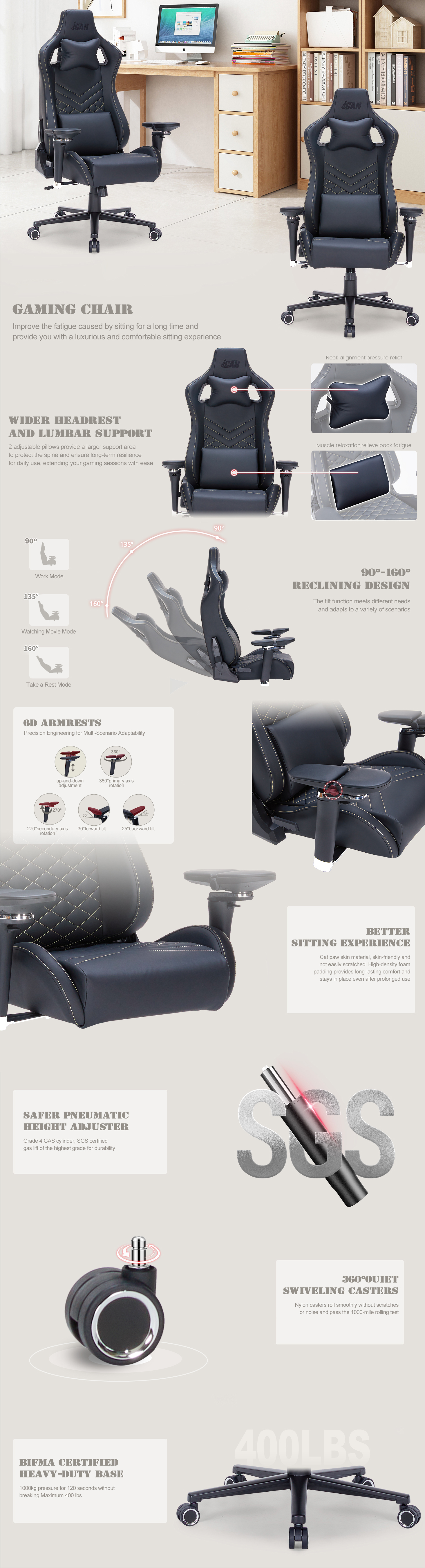 • iCAN 97031 PU Leather 6D Armrest Gaming Chair,Black