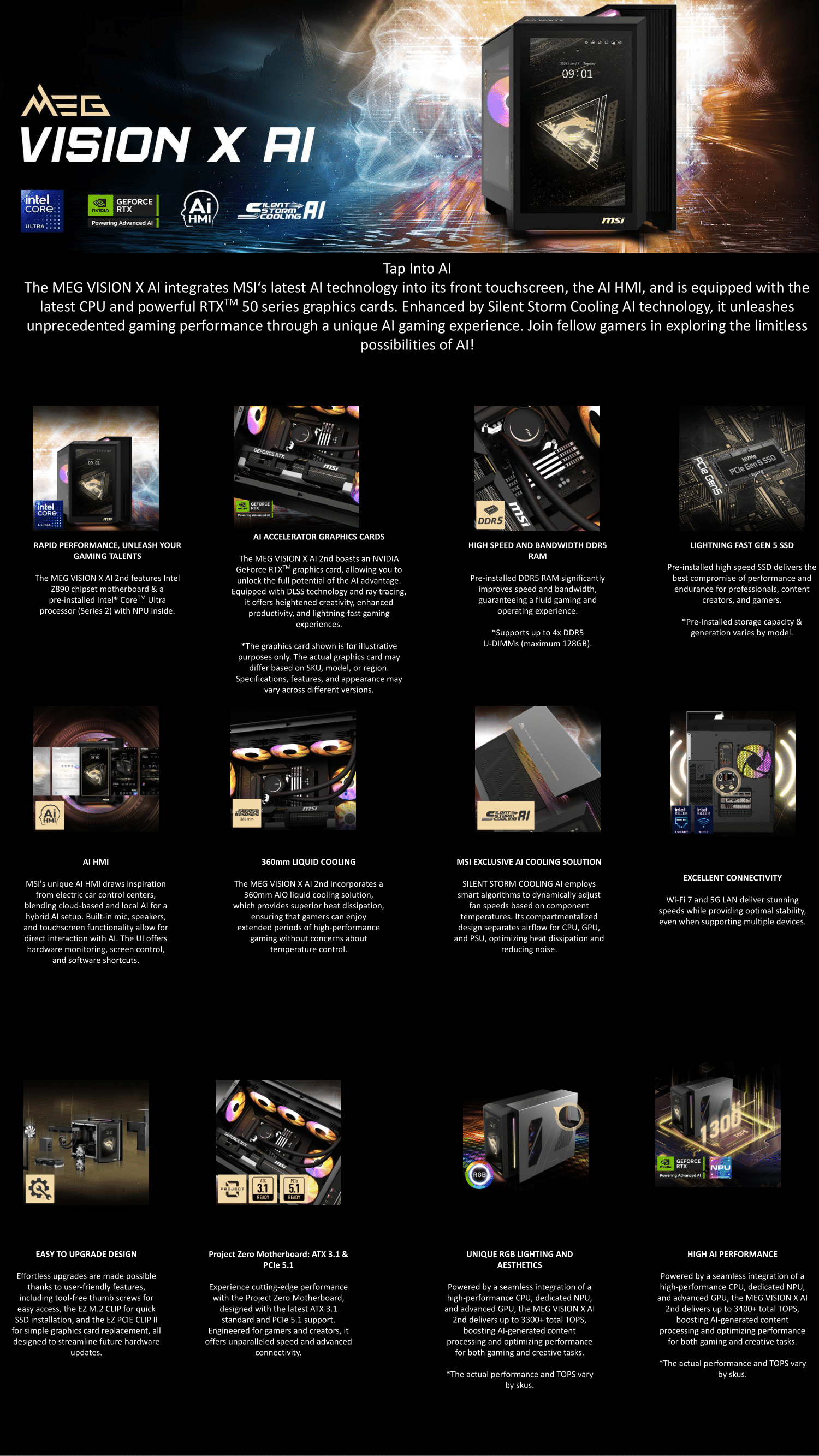 The MEG VISION X AI integrates MSI's latest AI technology into its front touchscreen, the AI HMI, and is equipped with the latest CPU and a powerful graphics card. Enhanced by Silent Storm Cooling AI technology, it unleashes unprecedented gaming performance through a unique AI gaming experience. Join fellow gamers in exploring the limitless possibilities of AI!