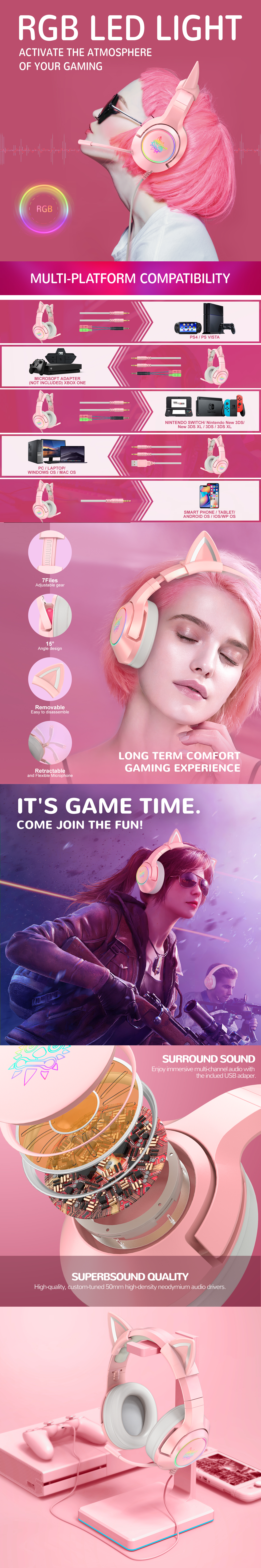 • Onikuma K9-Pink Gaming Headset with Cat Ears