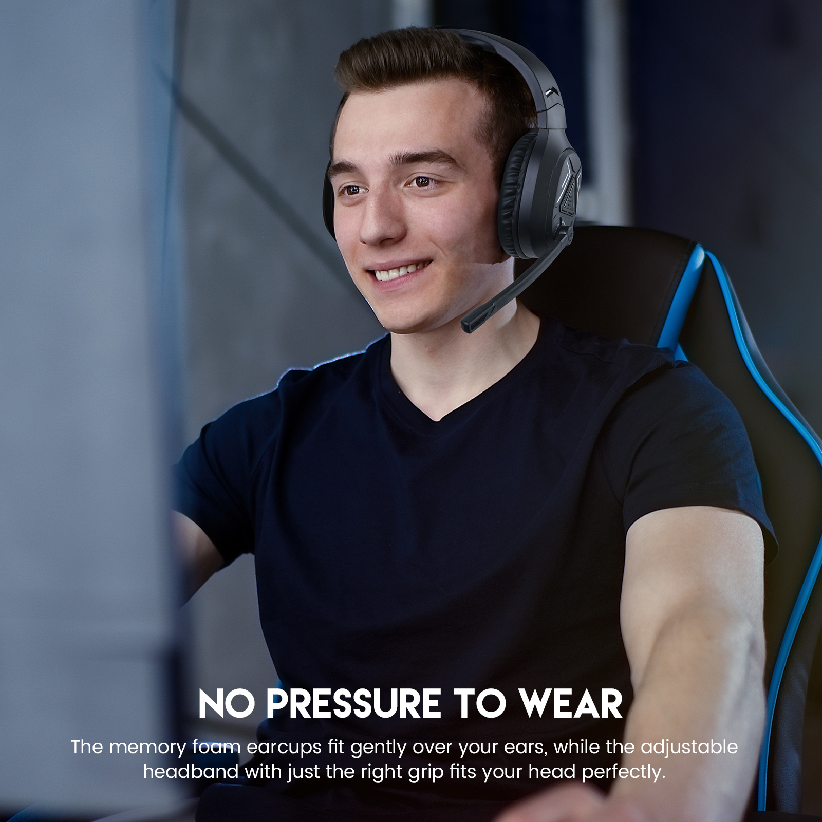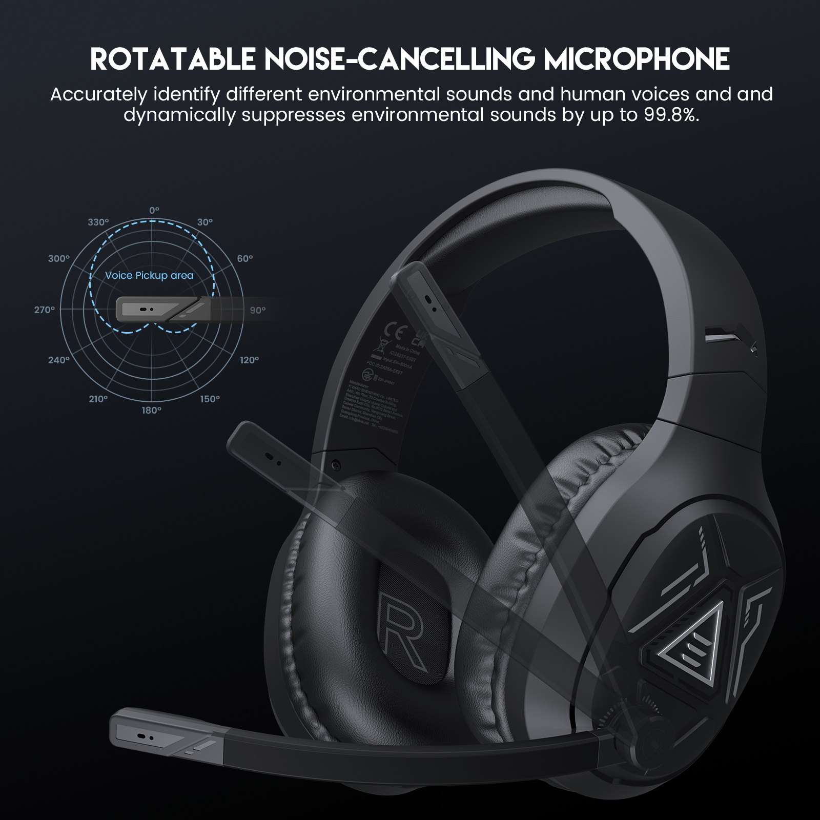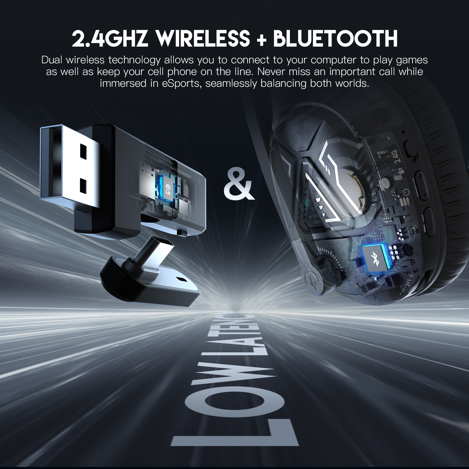 · Stable Connection & 3D Stereo Sound: E5BT wireless gaming headset combines high performance 2.4GHz lossless wireless technology for the accessible connection up to 49 feet in an unobstructed space. Lower latency (≤20ms) and featuring 50mm driver with 33% extra sound effect ensure that the wireless gaming headphones provide higher quality stereo sound, which makes you sense voice of directions, footsteps and every details clearly in games for a better immersive gaming experien