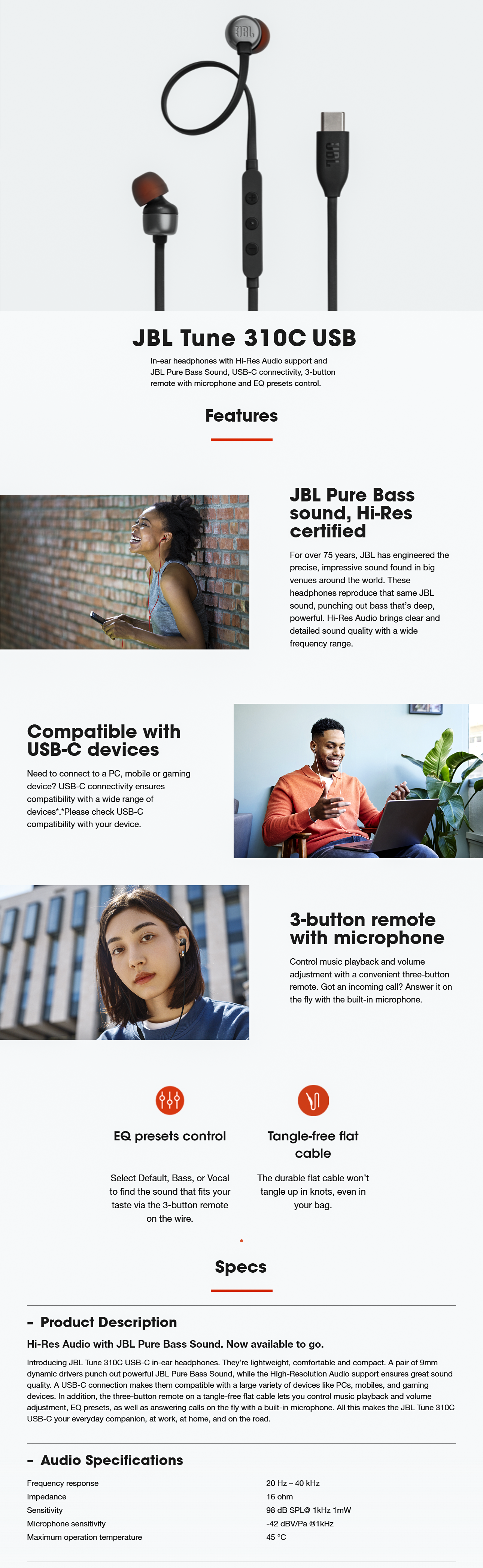 • JBL Tune 310C Wired In-ear USB-C Headphones, Black
