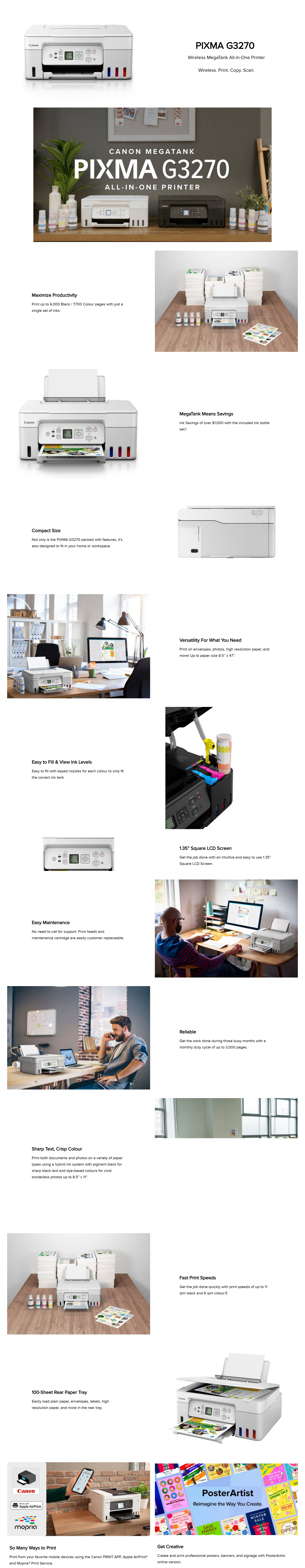 • Canon PIXMA G3270 MegaTank Wireless 3-in-1 Inkjet Printer, White