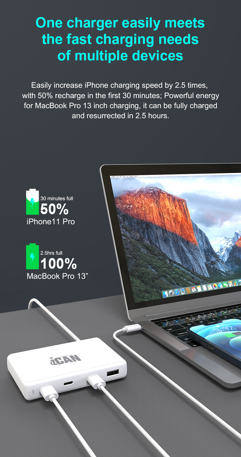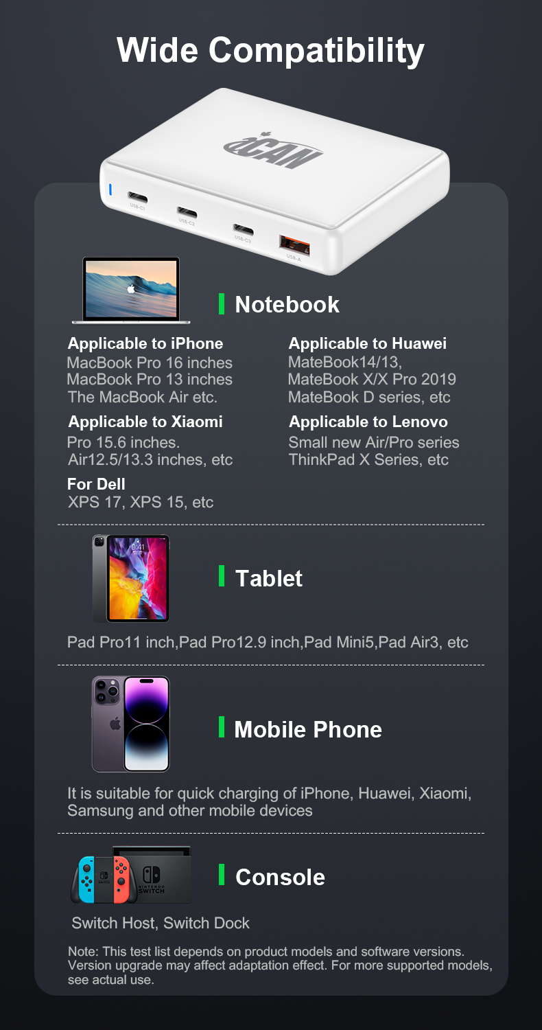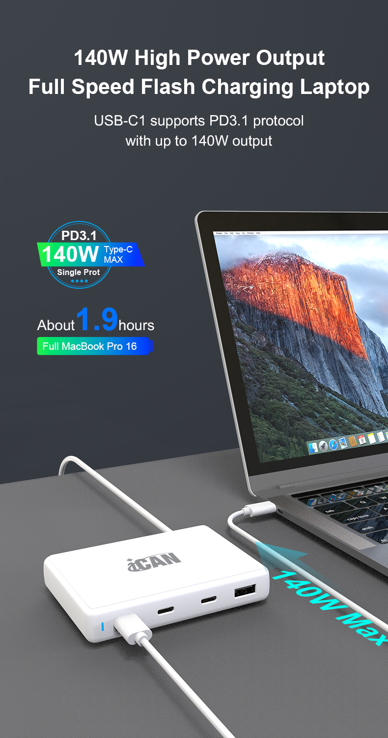 • iCAN 140W 4-Port GaN Slim Wall Charger with 3 USB-C and 1 USB-A