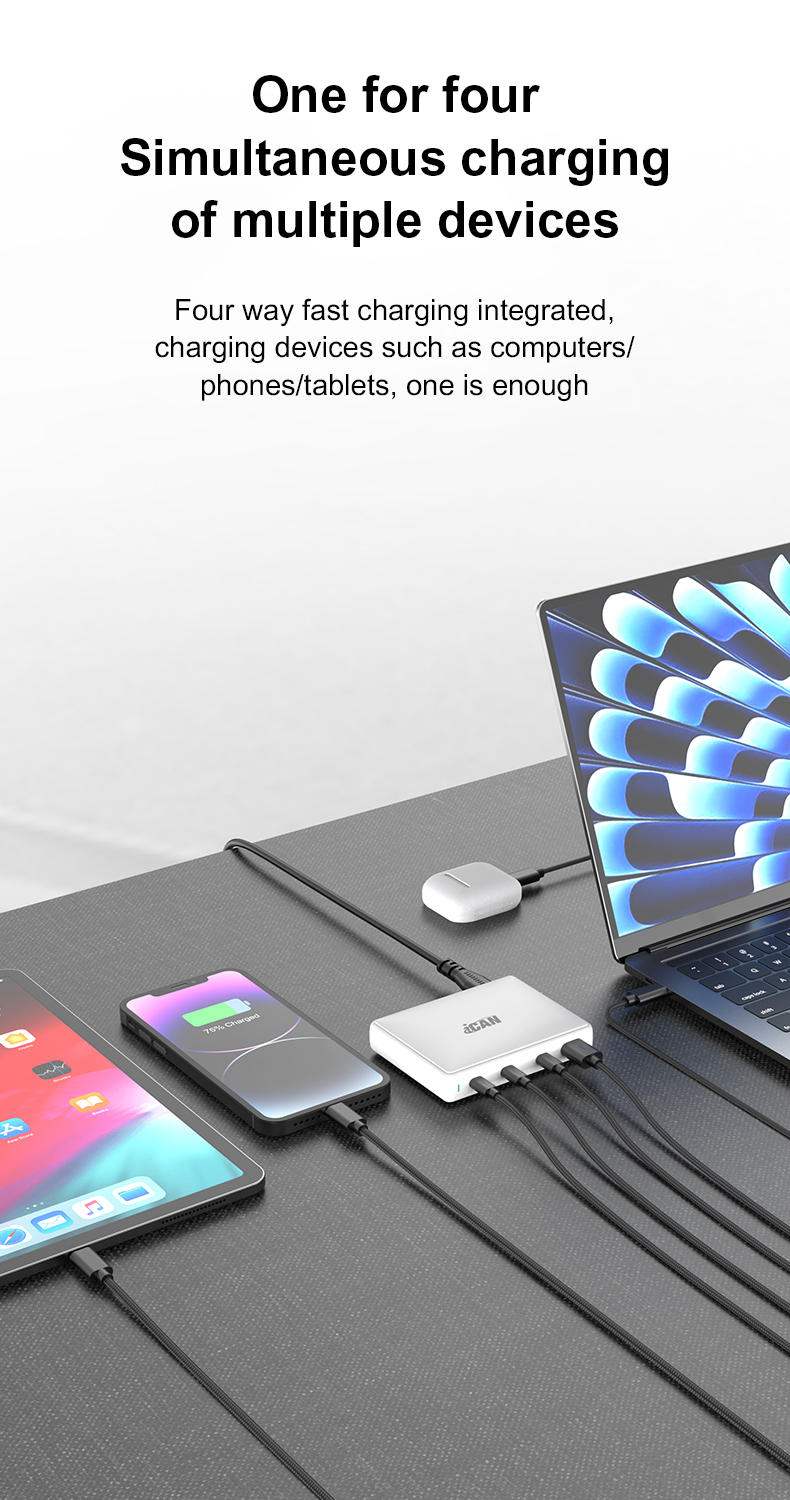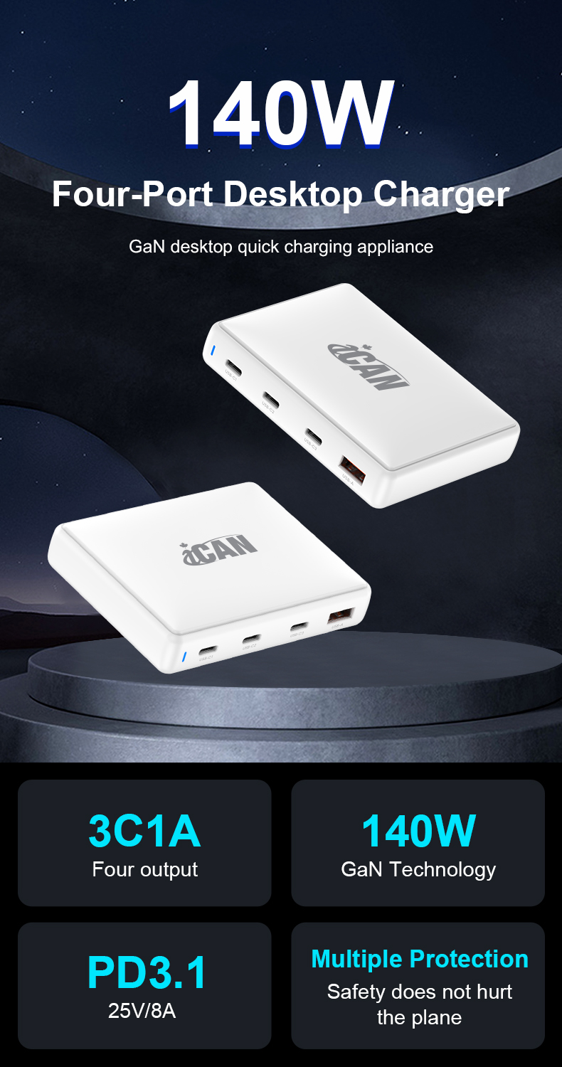 iCAN 140W 4-Port GaN Slim Wall Charger with 3 USB-C and 1 USB-A