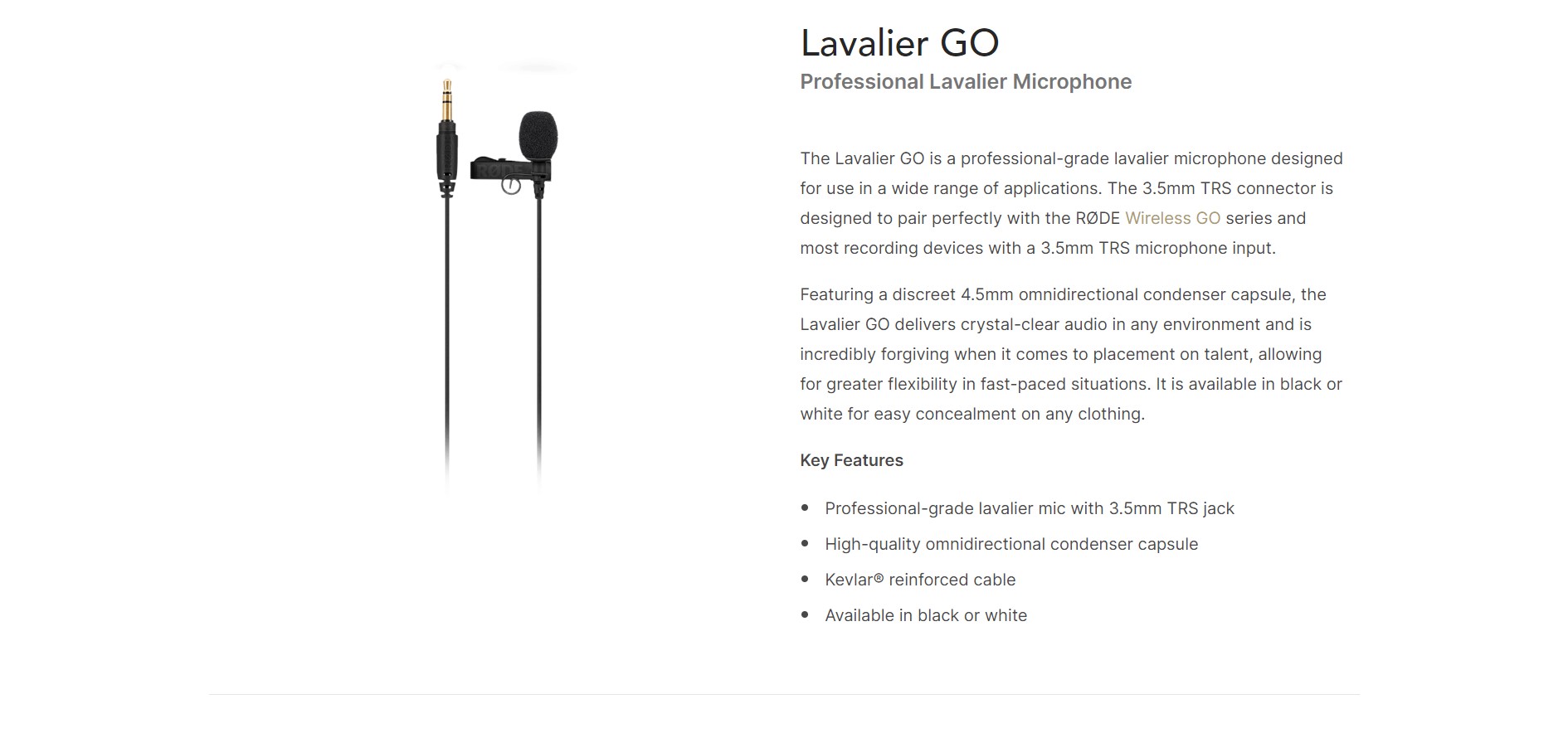 RODE Lavalier Go Professional Lavalier Microphone, Black | 3.5mm TRS Connector | High-quality Omnidirectional Condenser Capsule | Kelvar® Reinforced Cable