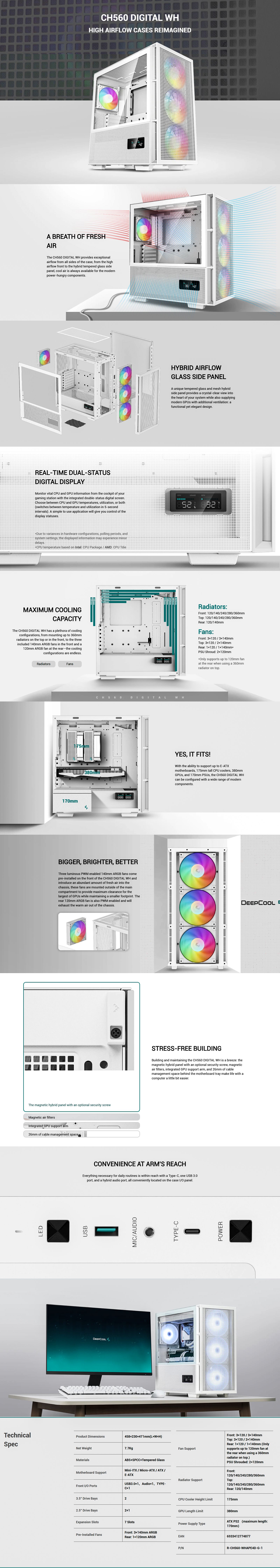 • DeepCool CH560 Digital ATX Airflow case, 3x Pre-Installed 140mm ARGB Fans, White