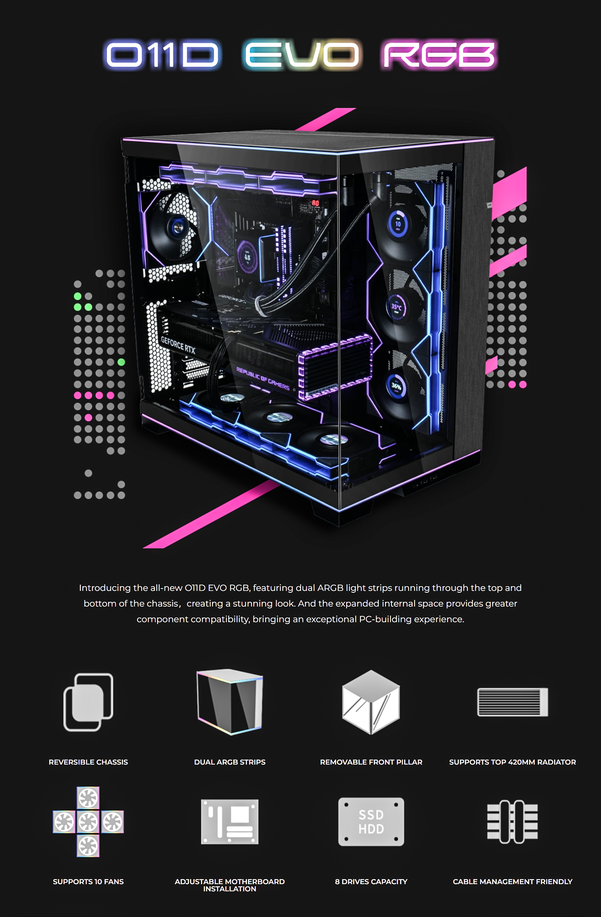 Introducing the all-new O11D EVO RGB, featuring dual ARGB light strips running through the top and bottom of the chassis?creating a stunning look. And the expanded internal space provides greater component compatibility, bringing an exceptional PC-building experience.\