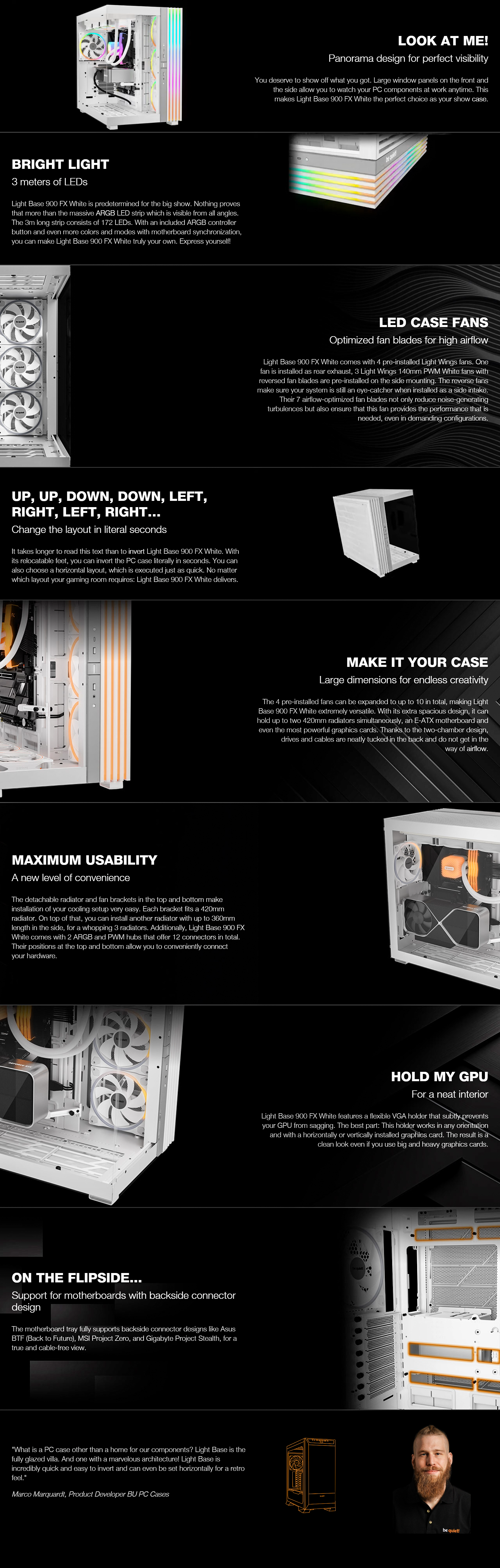 Light Base 900 FX White features a flexible VGA holder that subtly prevents your GPU from sagging. The best part: This holder works in any orientation and with a horizontally or vertically installed graphics card. The result is a clean look even if you use big and heavy graphics cards.