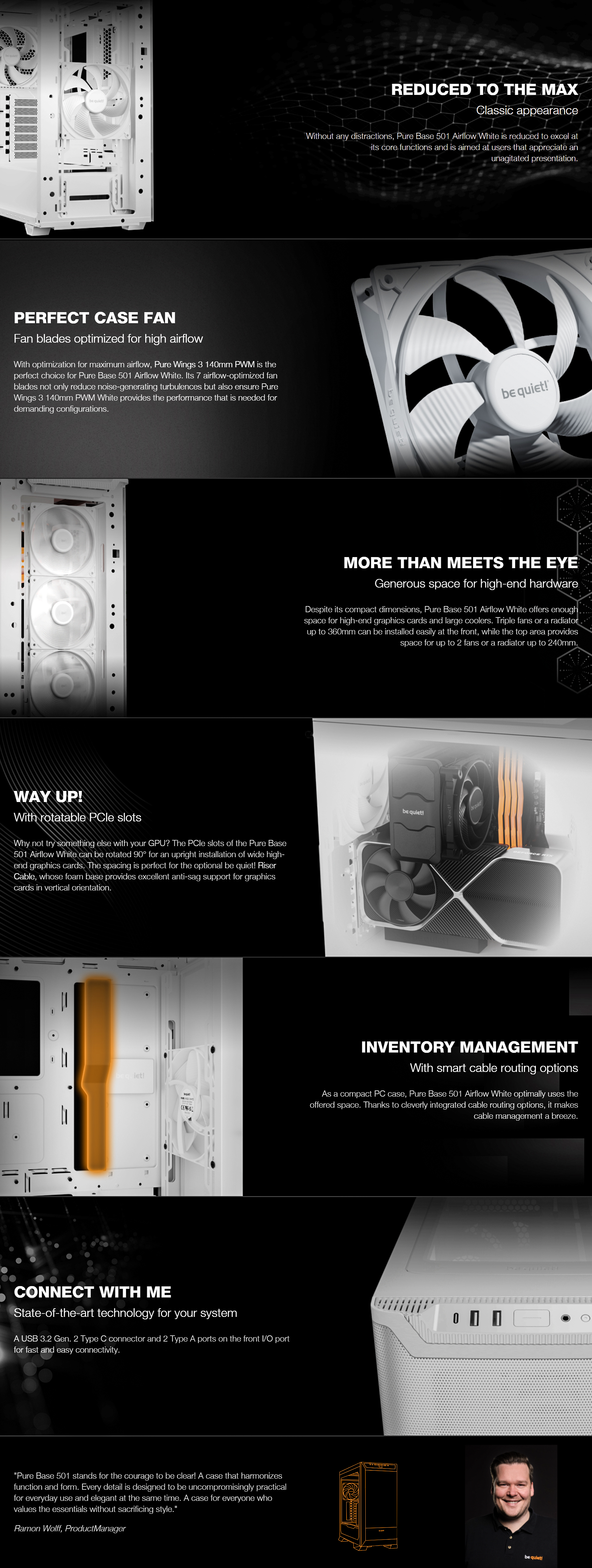 As a compact PC case, Pure Base 501 Airflow White optimally uses the offered space. Thanks to cleverly integrated cable routing options, it makes cable management a breeze.