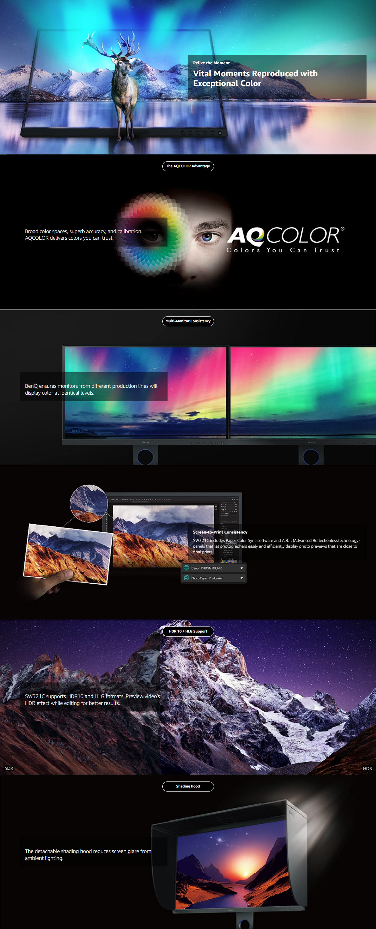 • SW321C 32” 4KIPS Photo&Video Editing Monitor w/AQCOLOR tech 99% AdobeRGB,100% sRGB/Rec.709, 95% DCI-P3/Display P3,Hardware Cali