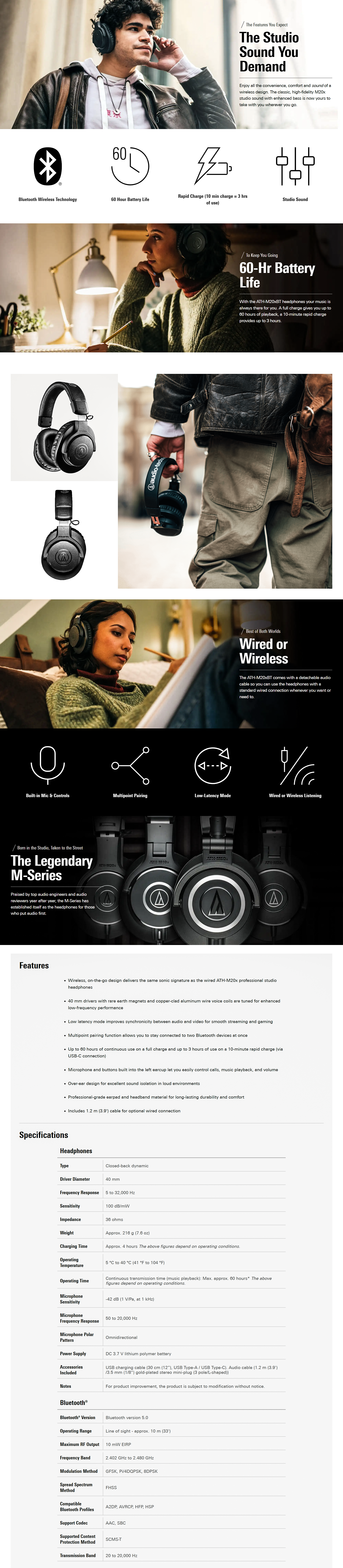 The ATH-M20xBT over-ear wireless headphones include all the features you want and the audio quality you demand. Inspired by our #1 selling ATH-M20x wired professional studio headphones and featuring powerful 40 mm drivers for enhanced low-frequency performance, the ATH-M20xBT Bluetooth headphones deliver an incredible listening experience with full-range, high-fidelity audio and enhanced bass.