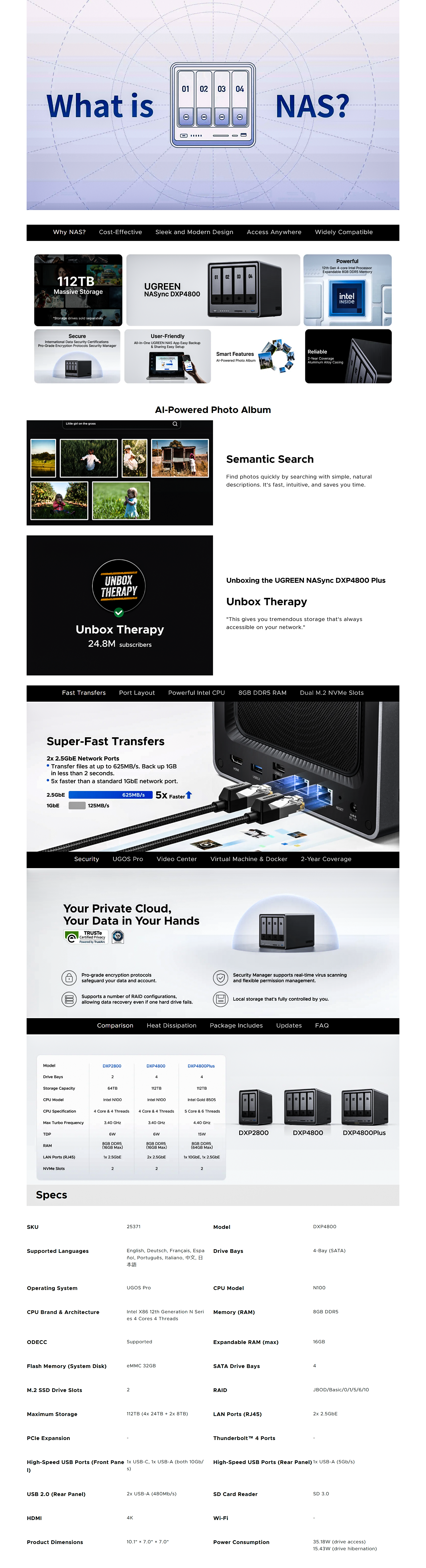 UGREEN DXP4800 4-Bay NAS (Diskless), 2x 2.5GbE LAN, 8GB DDR5 RAM, Intel N100 quad-core CPU, 4K HDMI, Store up to 112 TB (4x 24TB + 2x 8TB), Supports 3rd-Party Drives