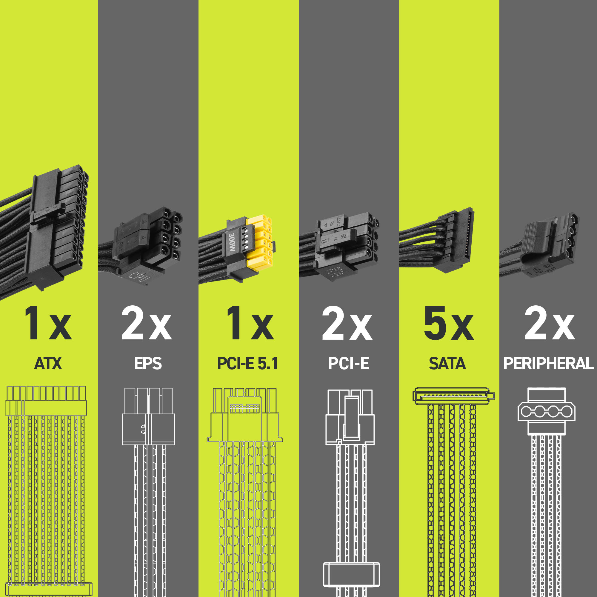 Through the native 16-pin (12V-2x6) PCIe connector, the PSU can provide up to 300W of power to a PCIe 5.1 GPU, and includes yellow highlights to help identify a loose connection.