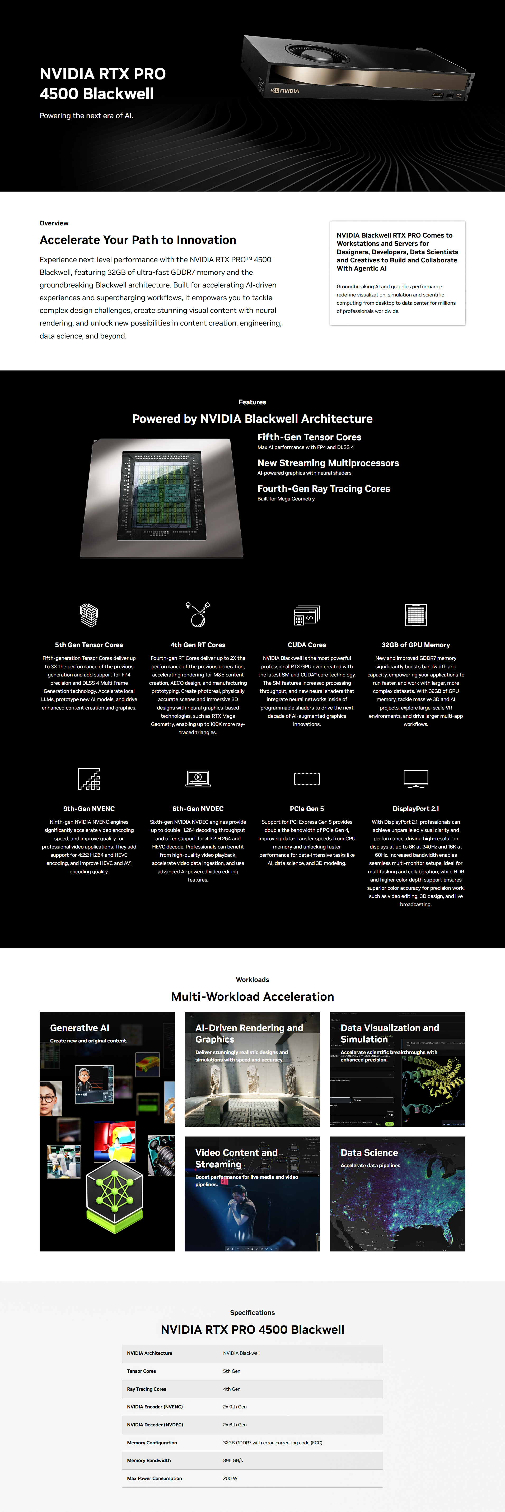 The NVIDIA RTX PRO™ 4500 Blackwell redefines professional workflows with groundbreaking AI acceleration, neural rendering, and 32GB of ultra-fast memory. Built on the revolutionary NVIDIA Blackwell architecture, it features 5th Gen Tensor Cores, 4th Gen RT Cores, and advanced CUDA® cores to power next-generation creative, engineering, and scientific applications. Professionals can deploy agentic AI systems, simulate hyper-realistic physics, and render cinematic-quality 3D worlds-all while handling massive datasets and complex workloads with ease. Whether designing sustainable infrastructure or driving generative AI pipelines, the RTX PRO 4500 delivers enterprise-grade reliability and future-proof performance for tackling the most demanding challenges.
