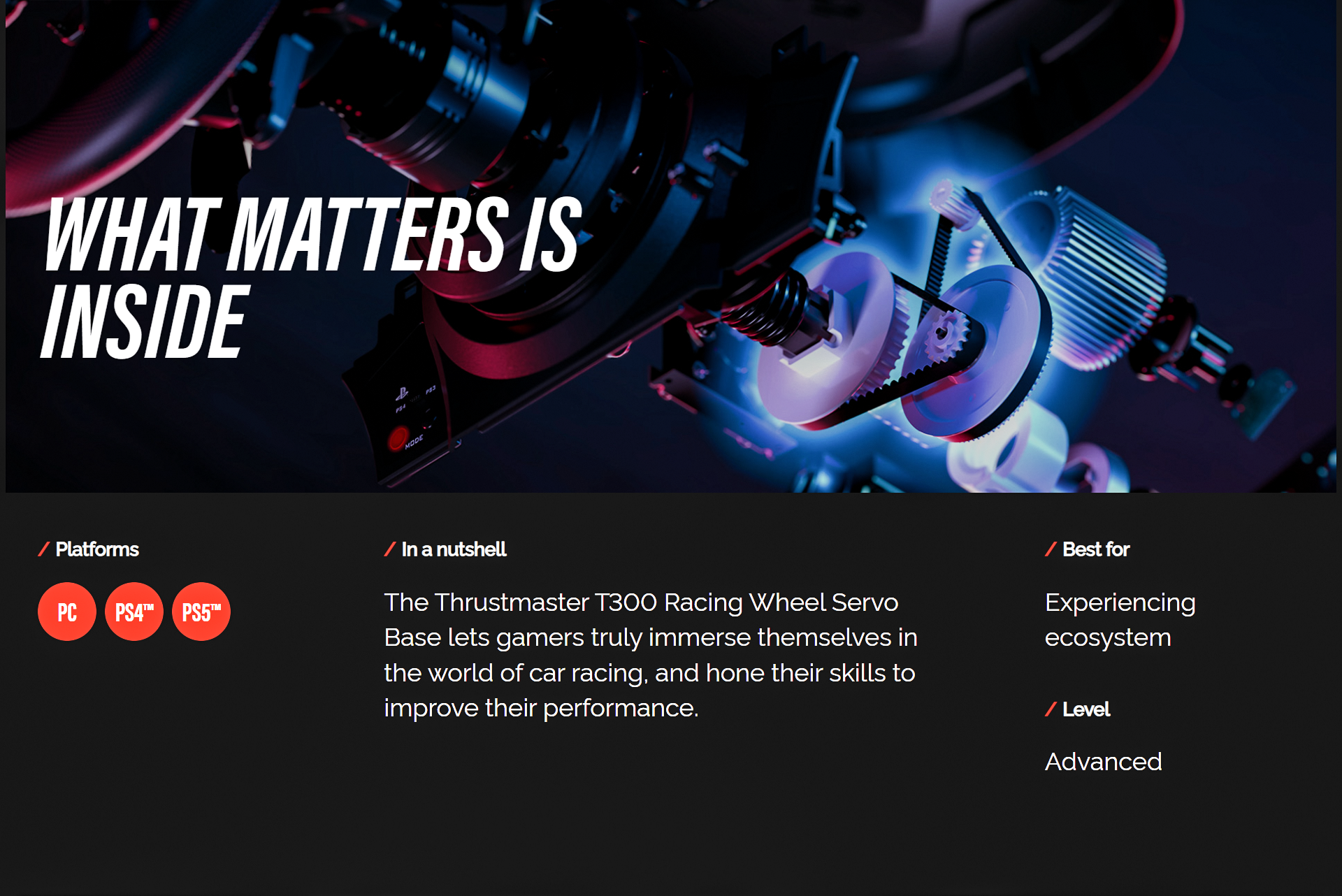 The Thrustmaster T300 Racing Wheel Servo Base lets gamers truly immerse themselves in the world of car racing, and hone their skills to improve their performance. In order to achieve this, Thrustmaster set out to create an exceptional solution for all gamers looking to radically enhance their experience in car racing games.