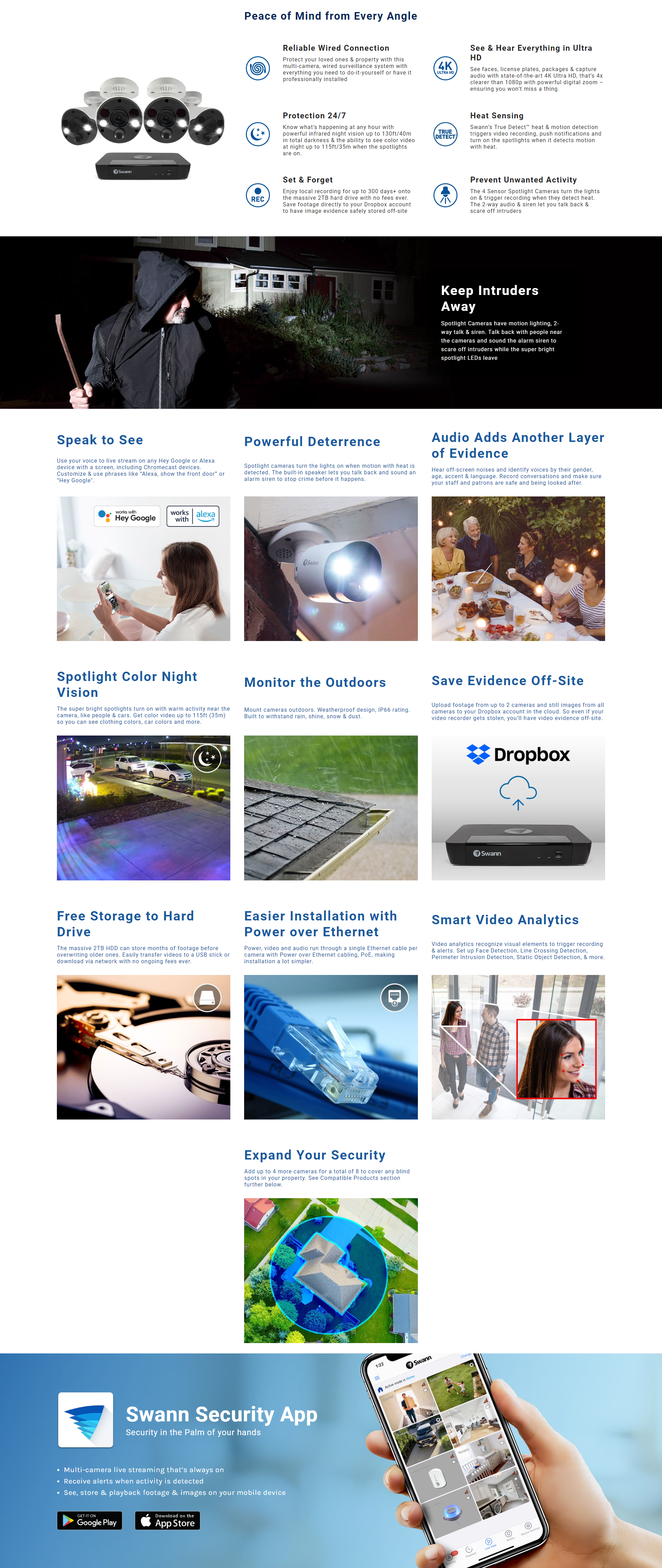 • Swann (885MSFB) 4K Ultra HD 8 Channel 2TB Hard Drive NVR Security System with 4 x Outdoor Spotlight Bullet Security Cameras wit