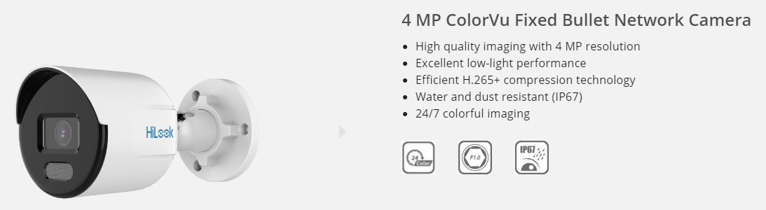 • HiLook Outdoor PoE Bullet IP Camera with ColorVu (24/7 full-color video), 2K QHD, with True WDR technology, IP67 weatherproof (