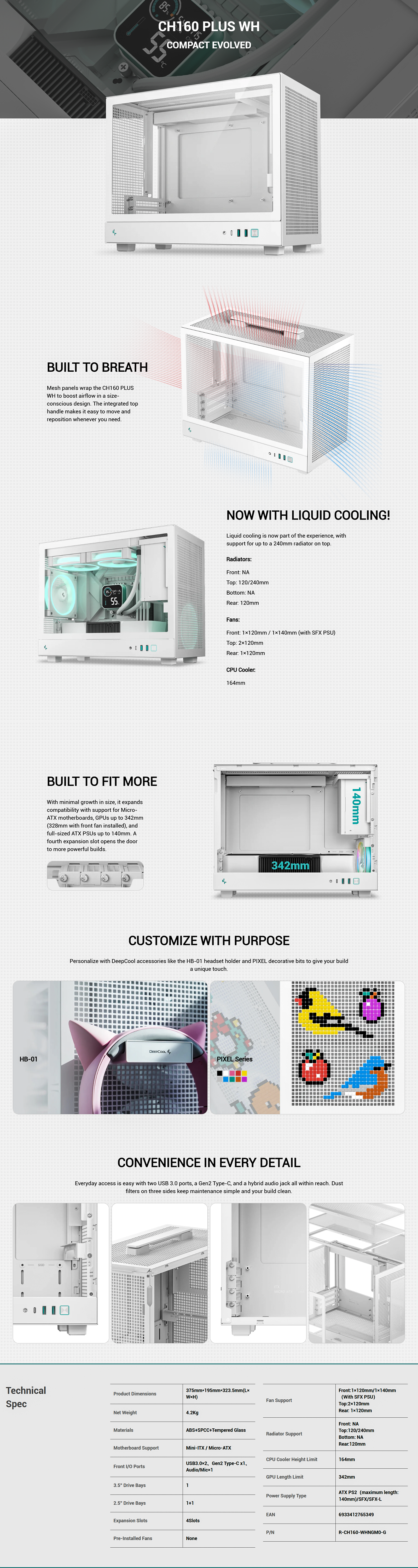 DeepCool CH160 PLUS WH Micro-ATX Mini Tower PC Case, White