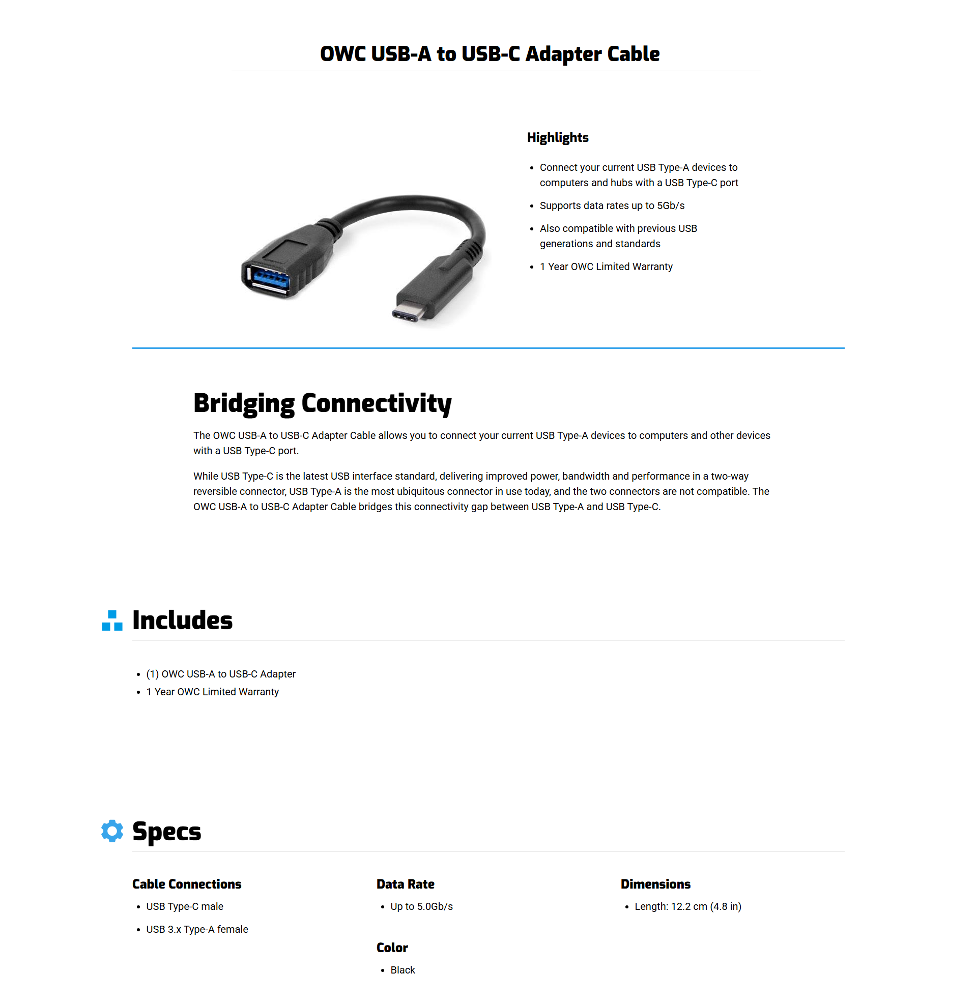 The OWC USB-A to USB-C Adapter Cable allows you to connect your current USB Type-A devices to computers and other devices with a USB Type-C port.