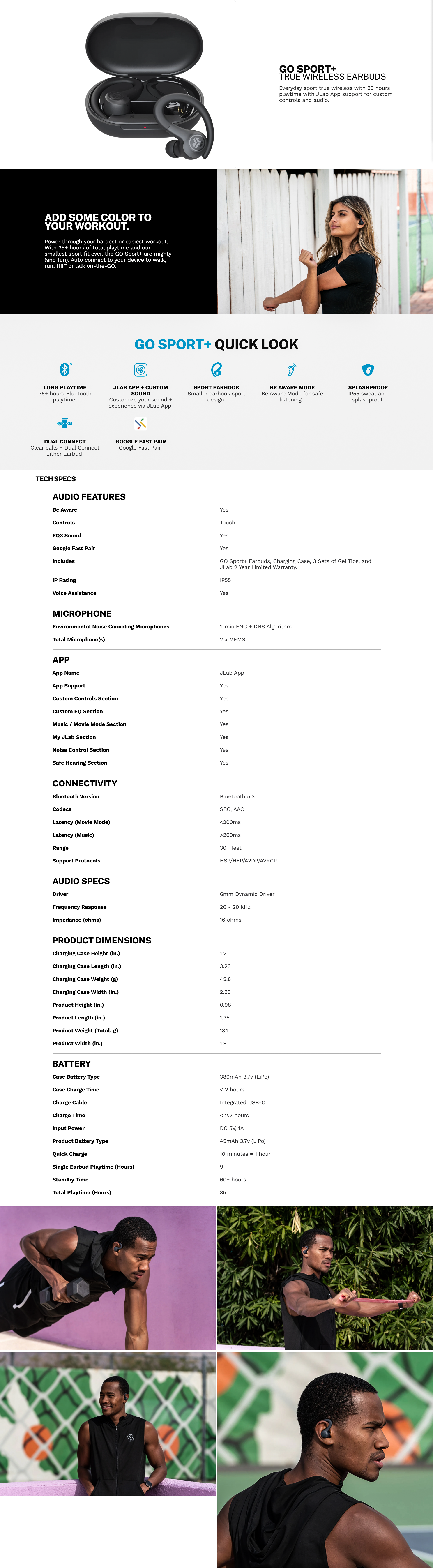 Power through your hardest or easiest workout. With 35+ hours of total playtime and our smallest sport fit ever, the GO Sport+ are mighty (and fun). Auto connect to your device to walk, run, HIIT or talk on-the-GO.