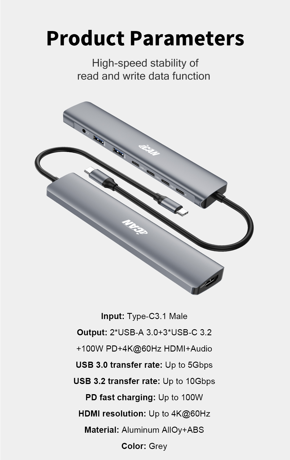 iCAN GS-DC48D 8-in-1 10Gbps USB-C Hub with 2 USB-A, 3 USB-C, HDMI, PD and Audio Port
