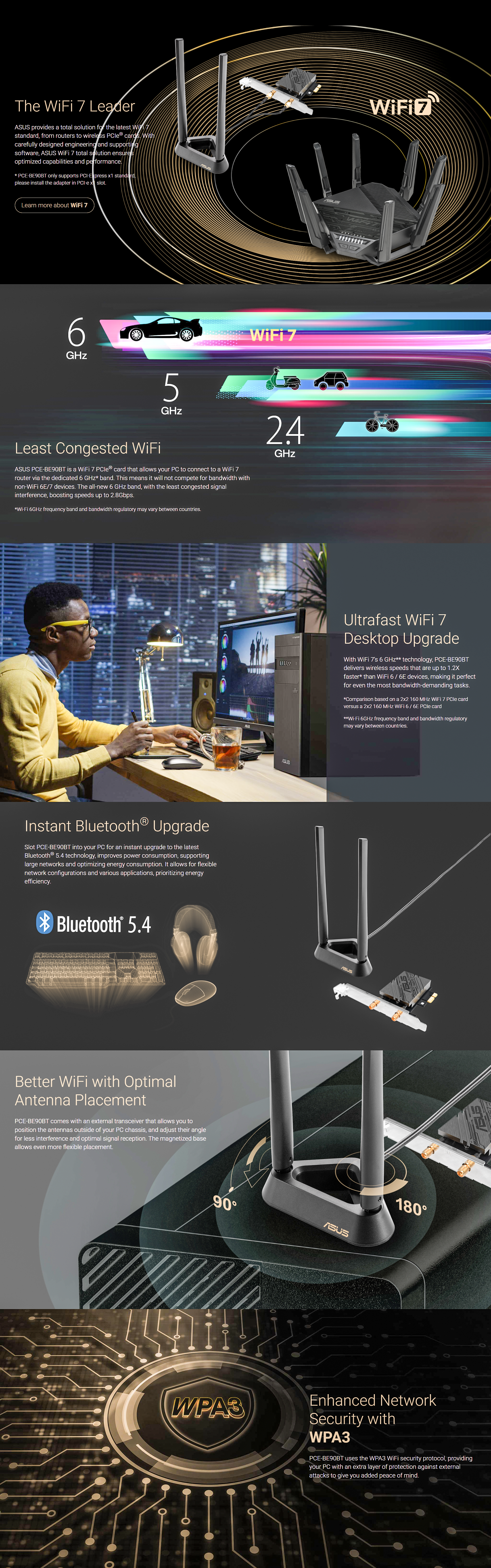 ASUS PCE-BE90BT is a WiFi 7 PCIe® card that allows your PC to connect to a WiFi 7 router via the dedicated 6 GHz* band. This means it will not compete for bandwidth with non-WiFi 6E/7 devices. The all-new 6 GHz band, with the least congested signal interference, boosting speeds up to 2.8Gbps.