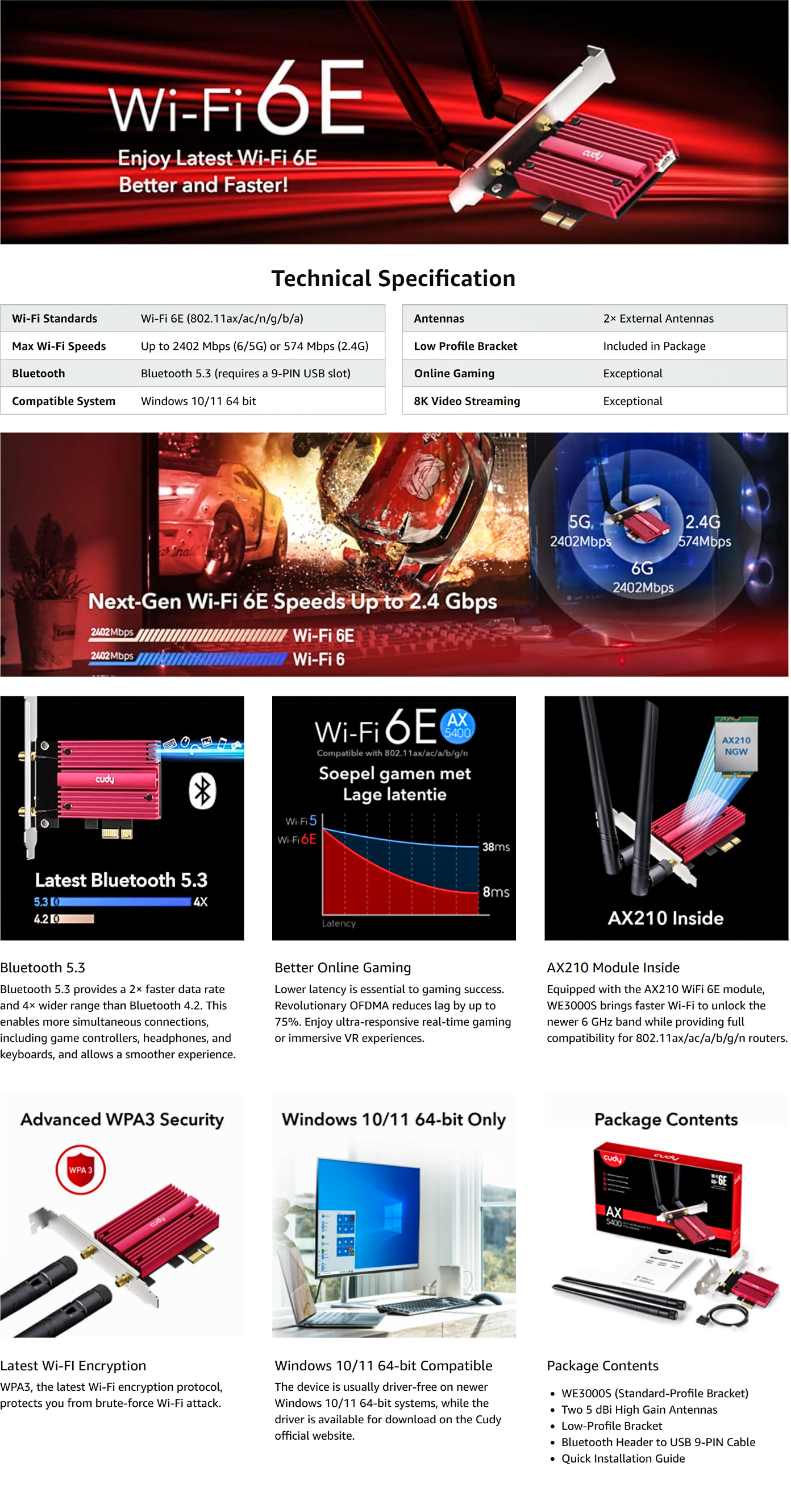 • Cudy WE3000S AXE5400 Tri-Band Wireless PCI-E Adapter