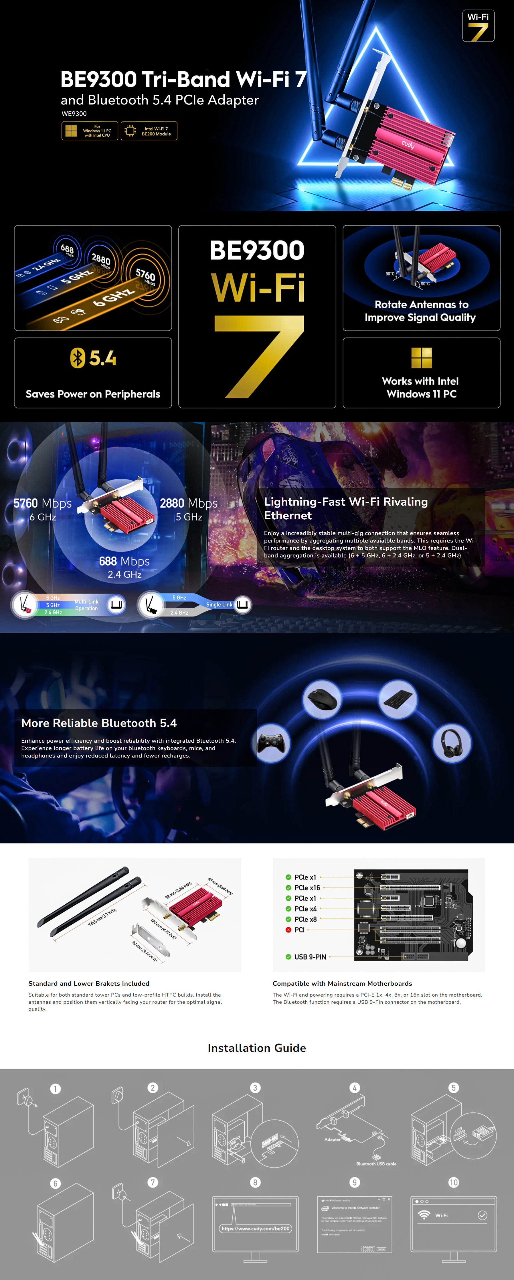 • Cudy WE9300 BE9300 Tri-Band Wi-Fi Bluetooth Wireless PCI-E Adapter