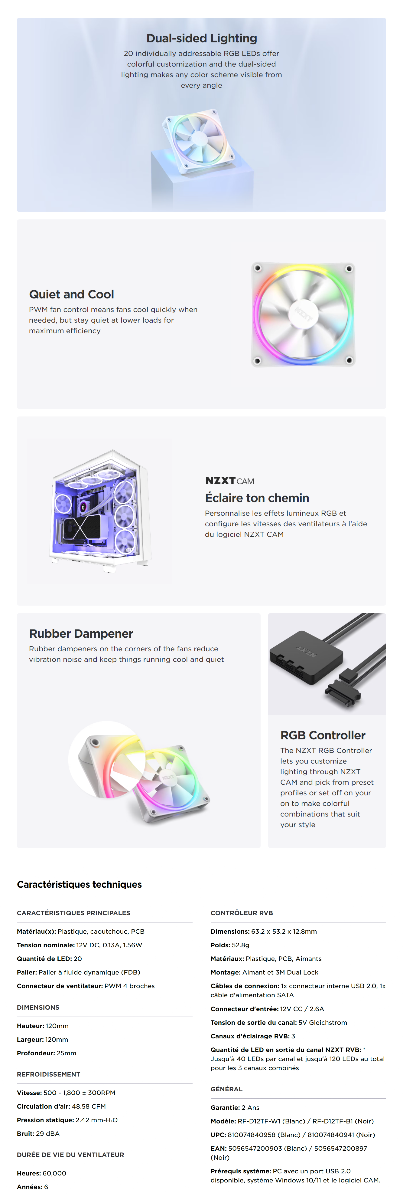 • NZXT F120 RGB DUO Ventilateur de boîtier Paquet de 3, Blanc