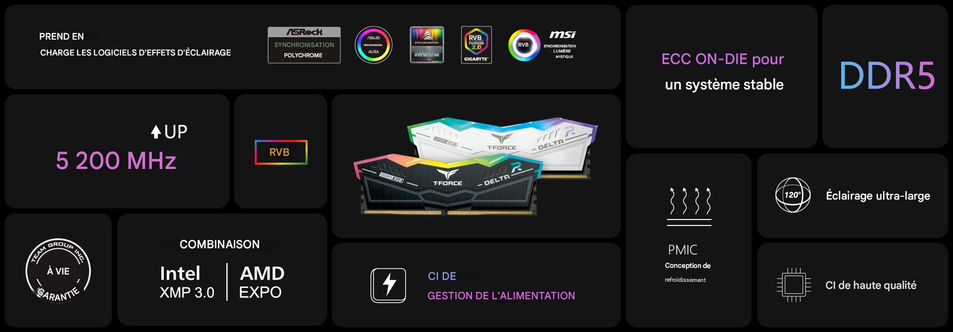 • TEAMGROUP T-FORCE DELTA RGB 32 Go (2x16 Go) DDR5 6000 MHz CL30 UDIMM