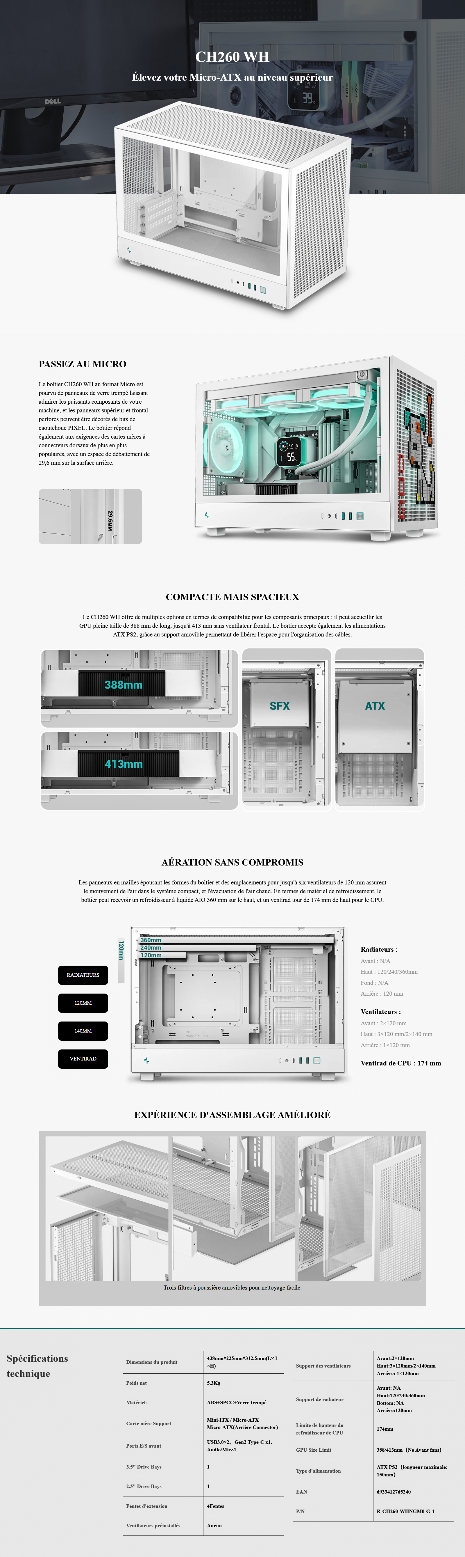 • DeepCool CH260 WH Micro-ATX Boîtier PC mini-tour, Blanc